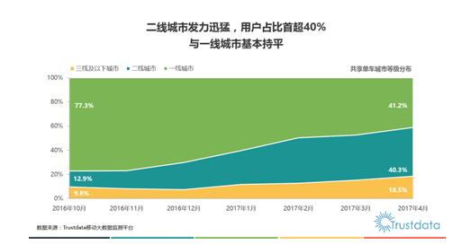 此外,Trustdata的陈诉还显示出二线城市用户的迅猛增长已经成为共享单车行业的显著特点。随着一线城市的共享单车逐渐趋于饱和,,二线城市以及三线以下城市将成为共享单车行业最后一战的主战场。而在二线城市用户的争夺战中,作为拥有更大产能且拥有更多地方政府合作经验的ofo无疑将继续领先。