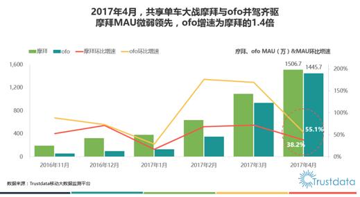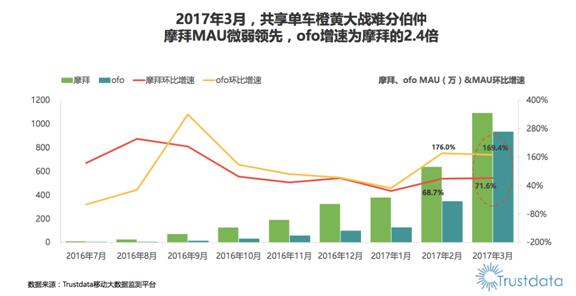近年来呈现出蓬勃发展的态势共享单车,被认为是互联网行业高增长的新引擎之一。而在共享单车行业中,长期领跑的ofo也颇受投资人与用户的关注。在此前发布的 2017 年 1 季度由业内知名数据机构Trustdata发布的陈诉中就显示ofo在 3 月以169.4%的高增速领骑行业,增长势头可谓极其迅猛。