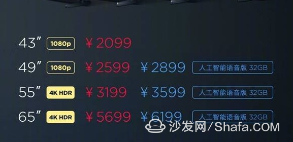 小米电视4A 43、49、55、 65 英寸尺度版售价别离为 2099 元、 2599 元、 3199 元、 5699 元;49、55、 65 人工智能语音版售价别离为 2899 元、 3599 元、 6199 元。