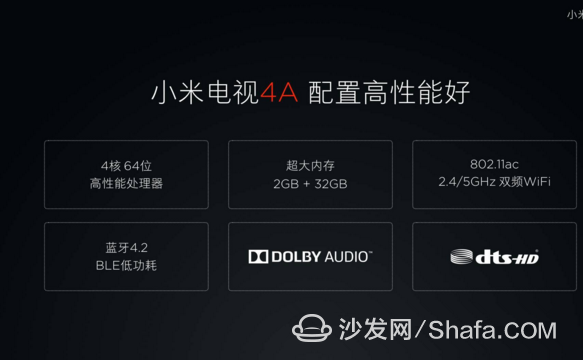 小米电视4A系列各尺寸统一采用了晶晨AmlogicT962CortexA53 处理器( 4 核高性能CPU,主频高达1.5GHz),和Mali-450MP5750MHz的GPU( 5 核高性能GPU)、2GBDDR4 高速内存,同时标配8GeMMC5. 1 高速闪存,还可选配32G超大闪存版本。