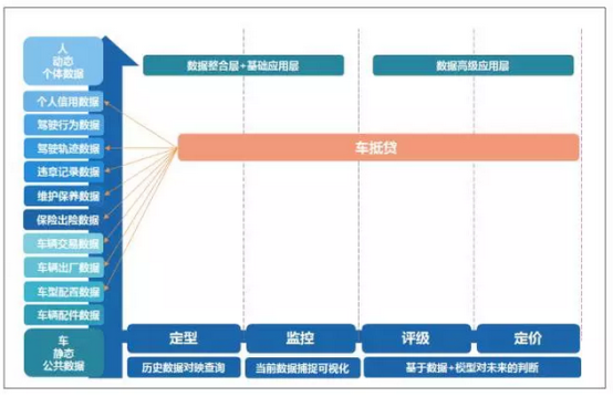 从纵向所需要的数据源看,,完整严谨的车抵贷交易需要在贷前查询车型配置数据,车辆出厂数据,车辆交易数据,保险出险数据,维护调养数据,违章数据,个人信用数据,在贷中持续监控驾驶轨迹数据以及出险,维护调养,违章等数据。