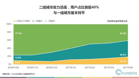 近日,国内第三方权威数据机构Trustdata发布的《 2017 年 4 月共享单车行业数据陈诉》显示,共享单车的渠道布局不停下沉,二线城市用户规模发展迅猛占比达到40.3%,比拟去年 10 月的12.9%,提高了27. 4 个百分点,涨幅明显。并且共享单车在二线城市的用户占比,已经与一线城市基本持平,成为共享单车市场最重要的增量市场。