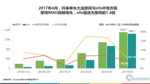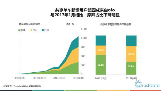 国内第三方权威数据机构Trustdata最新发布的《 2017 年 4 月共享单车行业数据陈诉》显示,在 2017 年 4 月整个共享单车行业实现了 1200 万的用户增长,其中ofo占到了40.4%的比例,达 485 万。与之比拟,摩拜占到了32.8%的比例,为 393 万人,落后ofo近百万。据了解,,在此前Trustdata发布的 2017 年 1 季度共享单车陈诉中ofo于 3 月份在新增用户上同样超出摩拜百万。