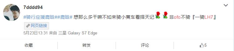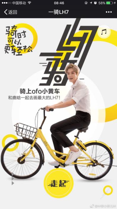 5 月 22 日,ofo小黄车官微推出了一场“与鹿晗一骑LH7”的活动,同时发布鹿先生亲自喊话的短视频,召唤所有ofo小黄车的粉丝,一起来参与骑行接力,点亮 13 座城市,画一个全世界最大的鹿晗logo“LH7”!传递环保正能量的同时,更有机会解锁超珍贵鹿boss神秘骑行花絮!听说里面还有舔屏级鹿晗视频,引无数迷妹尖叫,期待满满。一时间,各地粉丝纷纷应媛,再次评释ofo小黄车,体现非ofo不骑。