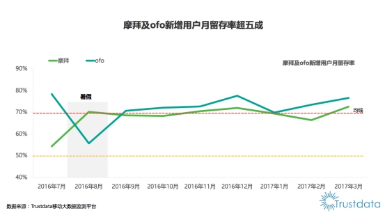 最新数据也显示,自去年 9 月进入城市后,ofo新增用户的月留存率始终高于行业70%的平均水平,且连续 7 个月超越摩拜的新增用户月留存率。