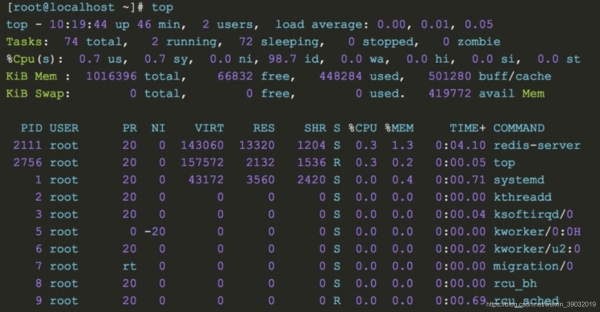 - top一行:从左到右依次为当前系统时间,系统运行的时间,系统在之前1min、5min和15min内cpu的平均负载值
