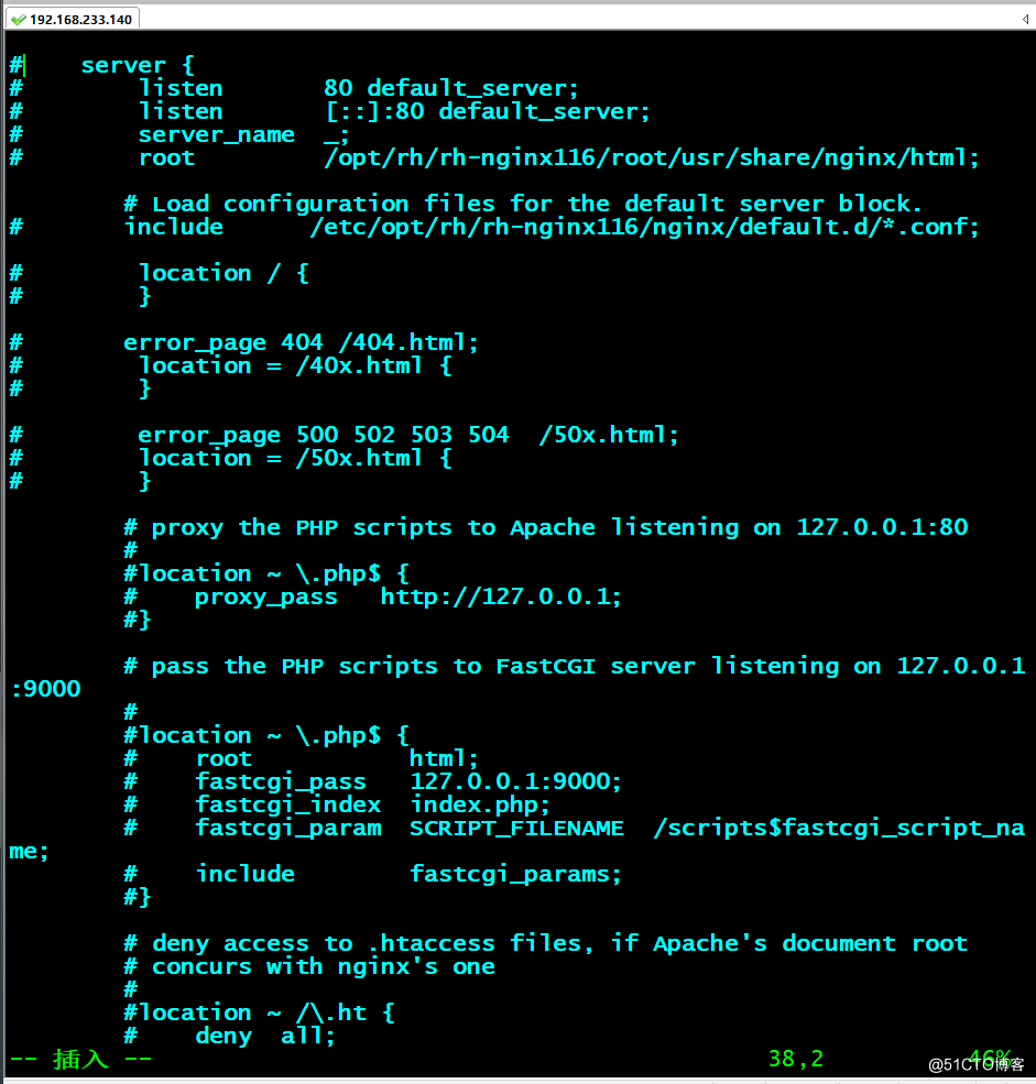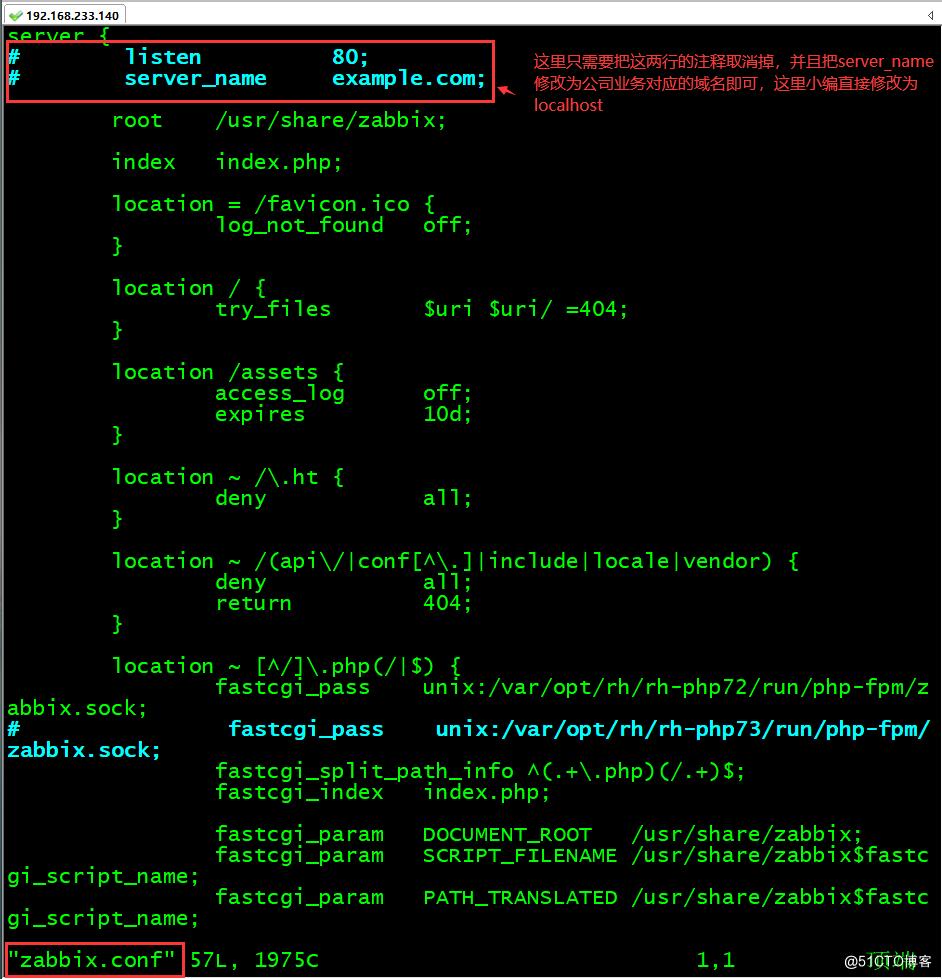 这里因为在配置文件中,我们配置的监听端口是80并且监听的域名是本地的,所以在主配置文件中,我们需要将这两条进行注释。
