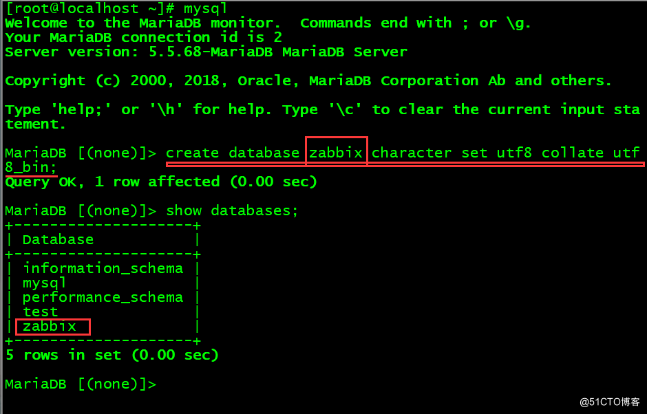 Mariadb [(none)] >create database zabbix character set utf8 collate utf8_bin; #创建数据库时指定字符集为utf8
