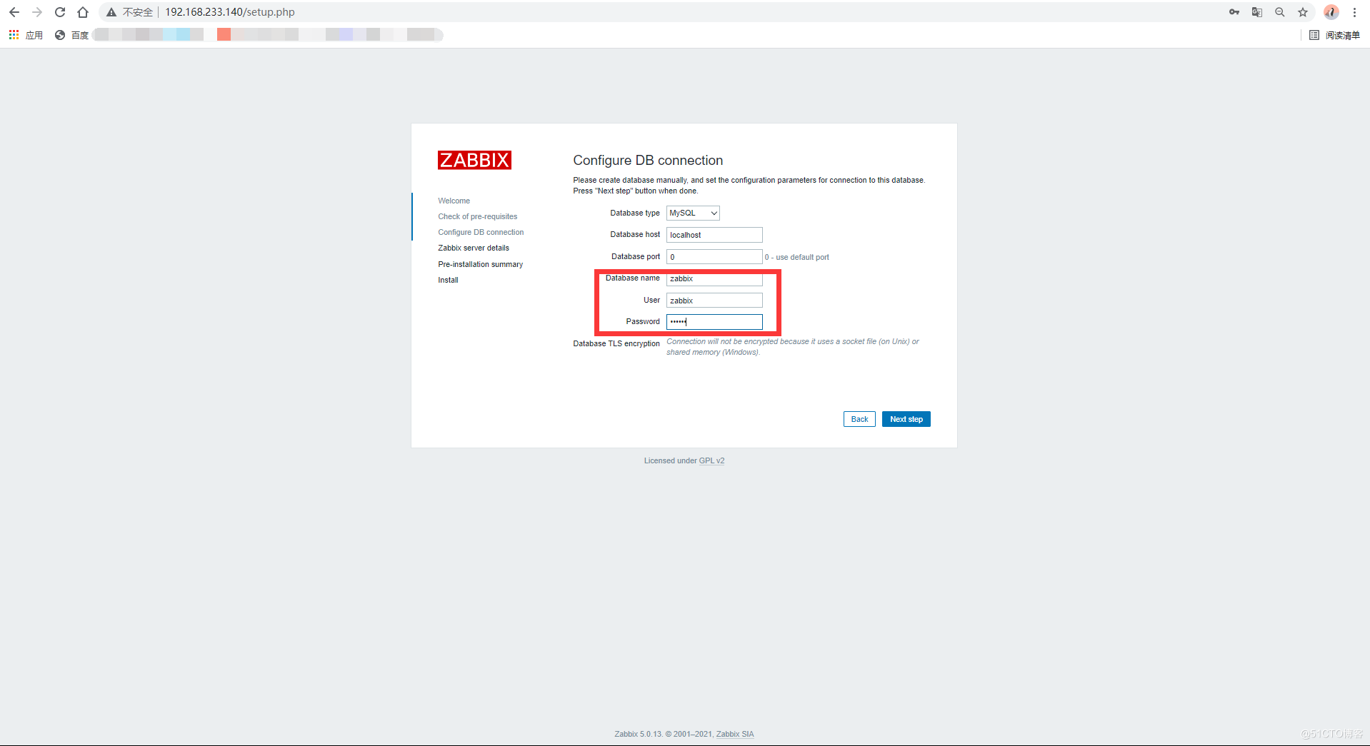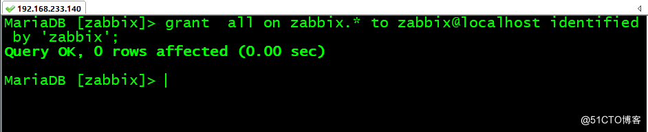 Mariadb [(none)] > grant all on zabbix.* to zabbix@localhost identified by 'zabbix';