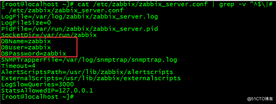 #DBName=zabbix #这里因为我们创建的数据库的名字就是zabbix 所以不需要修改,但是如果有同学在创建数据库时,数据库名不是zabbix的,这里就需要进行修改了