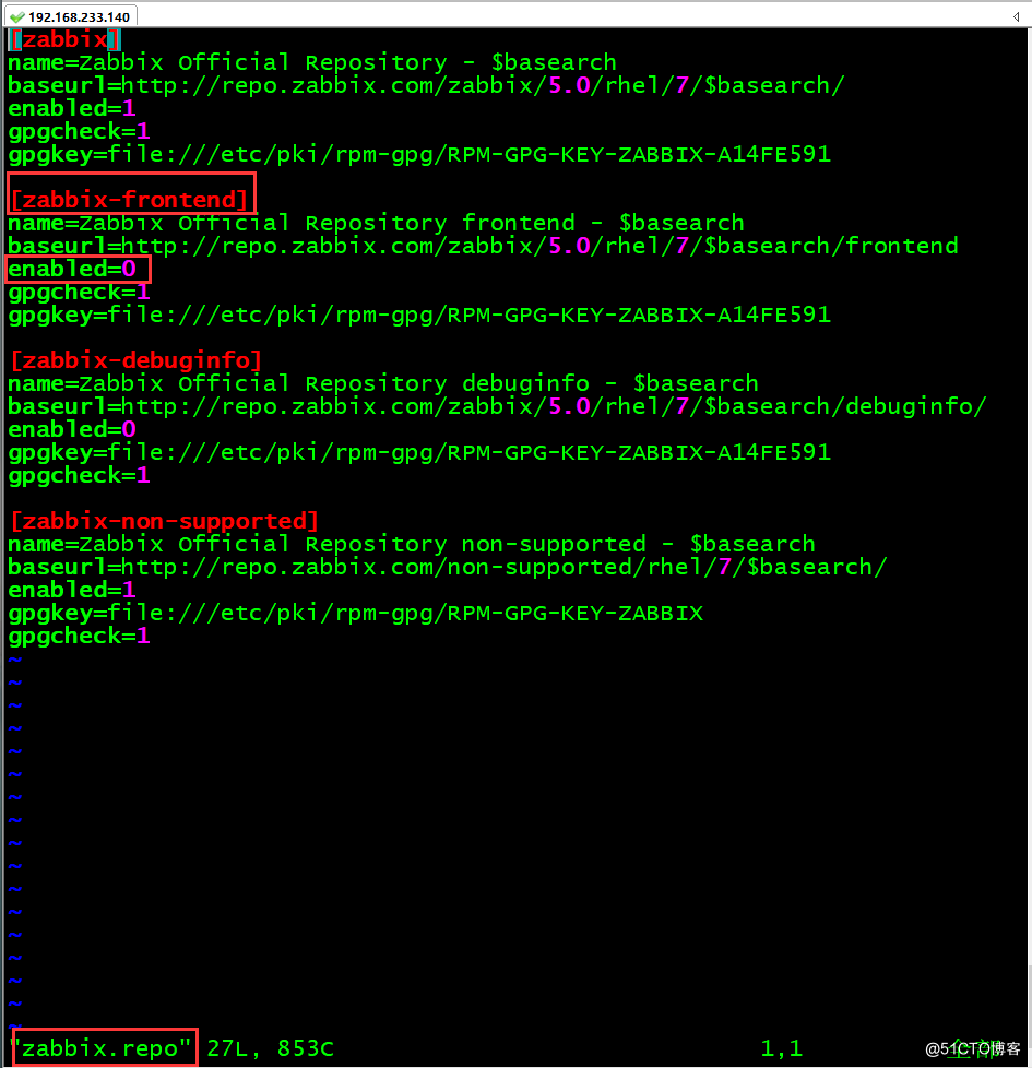 这里安装完成之后,我们需要对之前下载的yum源文件进行修改,因为在5.0版本的zabbix的源中,web前端的源是被默认禁用的,我们需要启用