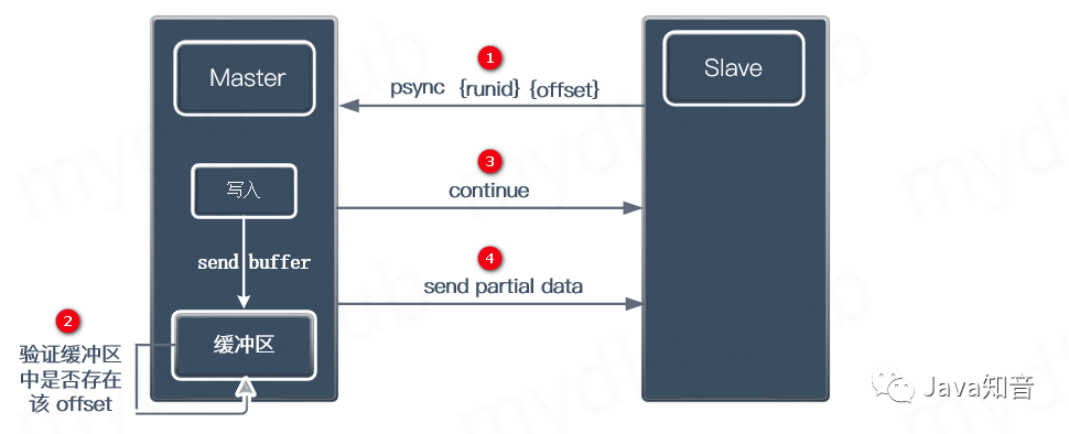 ④ Master 节点从复制缓存区拷贝数据,从 Slave 节点发送的 offset 开始,到 Master 节点缓存区记录的 offset 结束,将这个范围内的数据给 Slave 节点。