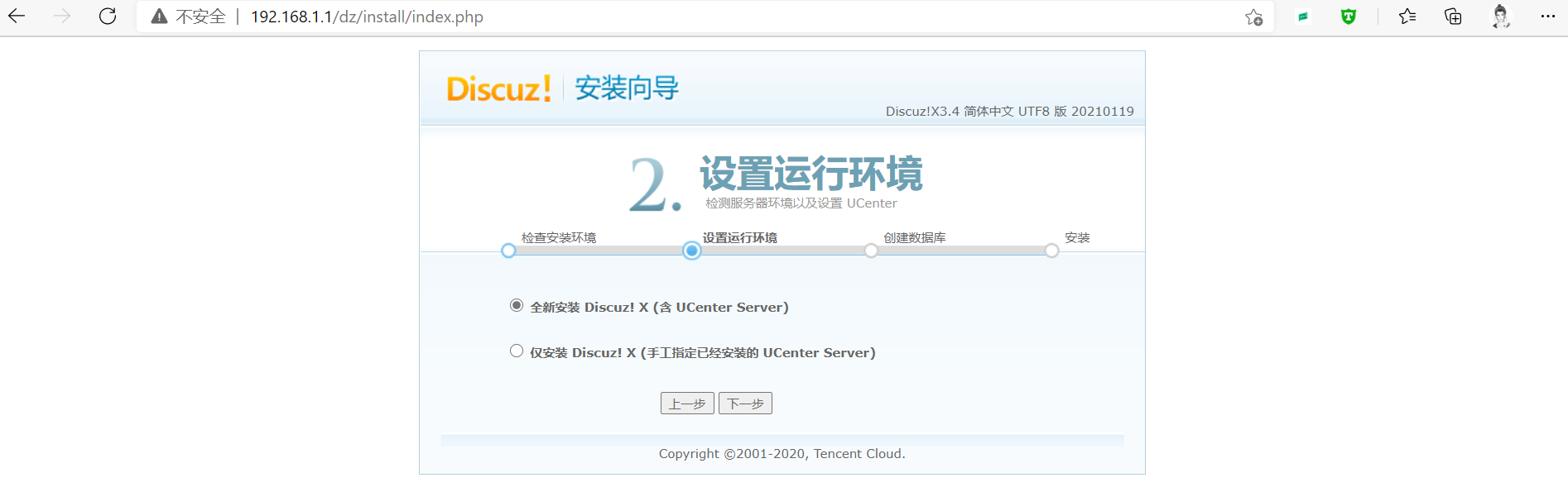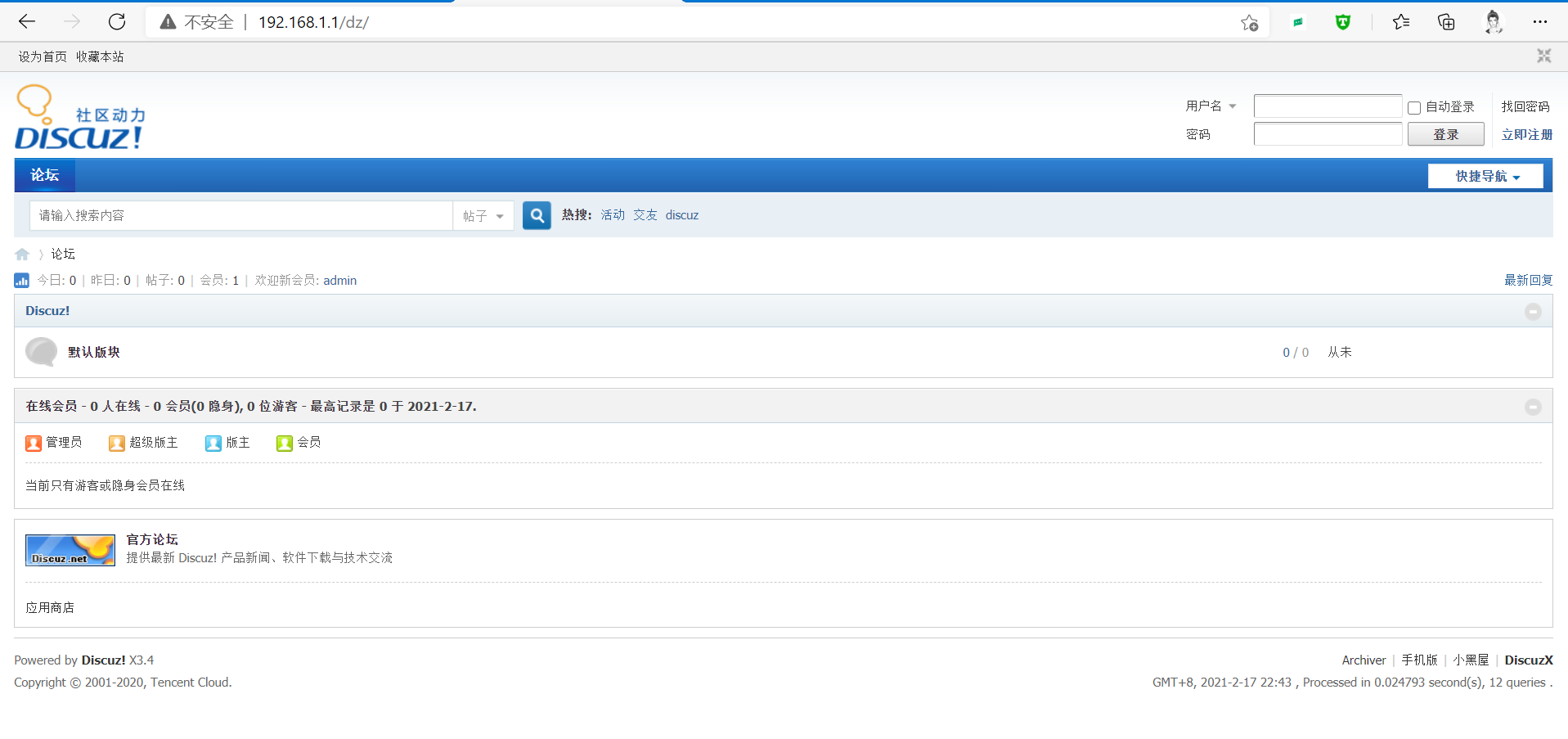 #上传 [root@node1 /]# ls bin Discuz_X3.4_SC_UTF8_20210119.zip #移动到/www网页目录下 mv upload/ /www/dz chmod 777 /www/dz<br>#保证数据库有dz库<br>#授权一个dz库的管理员<br>#注意安装是IP为数据库的IP不要写错<br>
