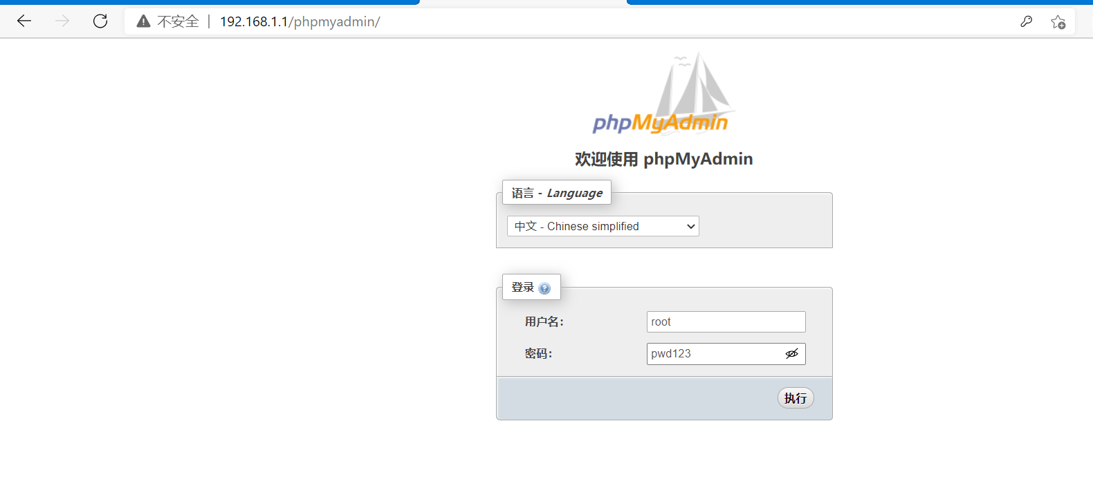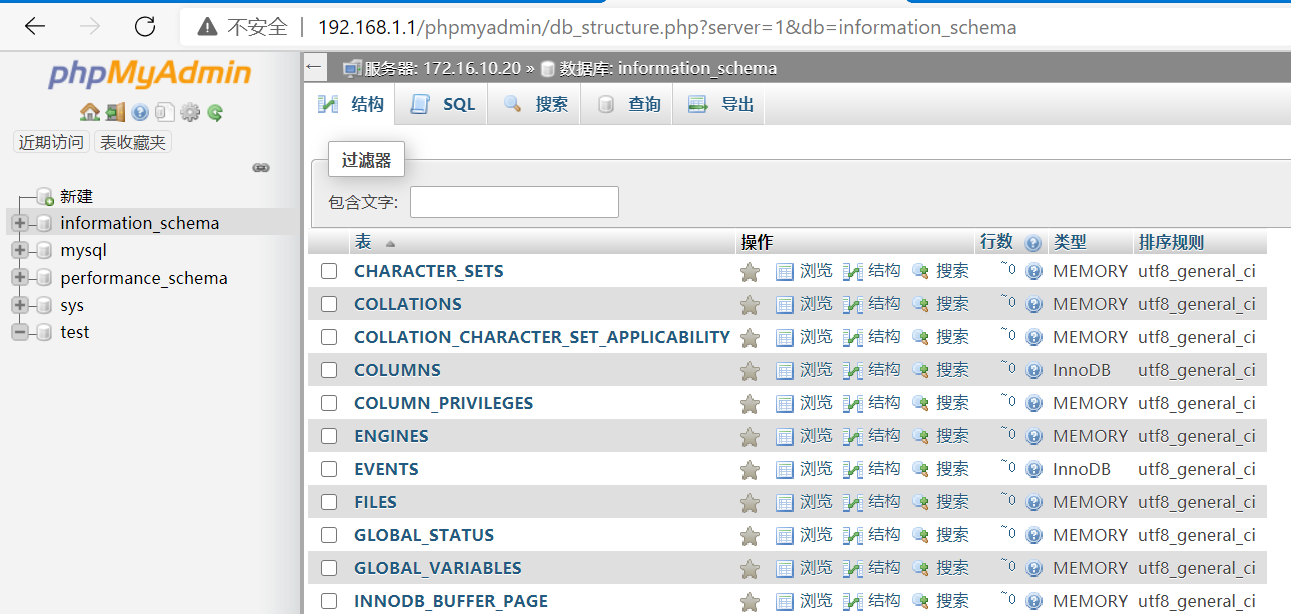 能够访问到以上两个界面,说明nginx和php的连接,没有问题,接下来是 php和mysql的连接。在这里我们使用一个phpMyAdmin的数据库管理工 具。