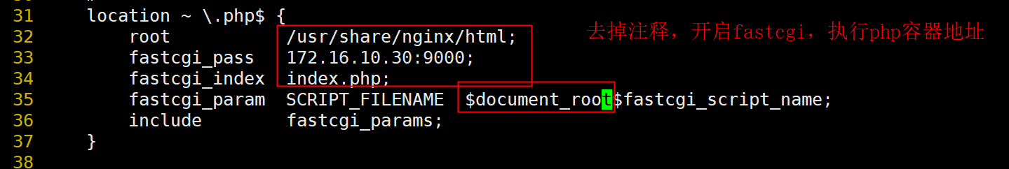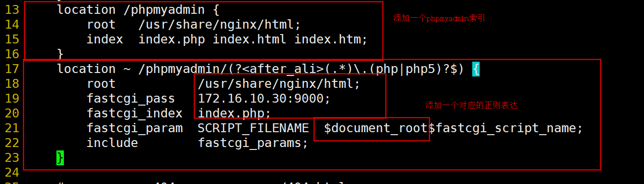 location /phpmyadmin { root /usr/share/nginx/html; index index.php index.html index.htm; } location ~ /phpmyadmin/(?<after_ali>(.*)\.(php|php5)?$) { root /usr/share/nginx/html; fastcgi_pass 172.16.10.30:9000; fastcgi_index index.php; fastcgi_param SCRIPT_FILENAME $document_root$fastcgi_script_name; include fastcgi_params; }