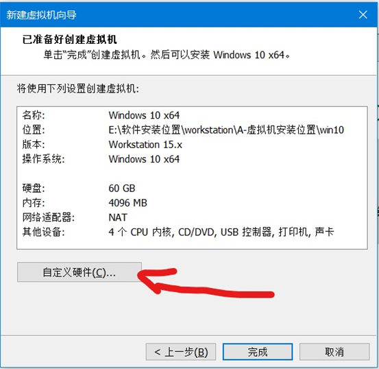 然后继续下一步,这时候不要直接点击完成,点击自定义硬件