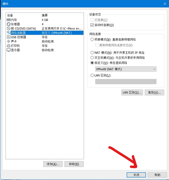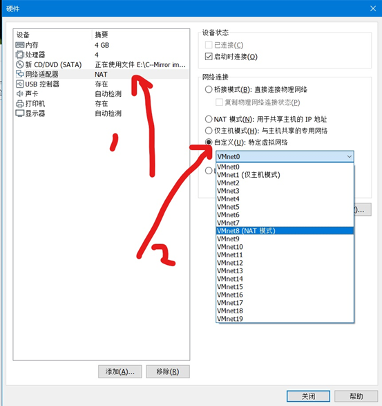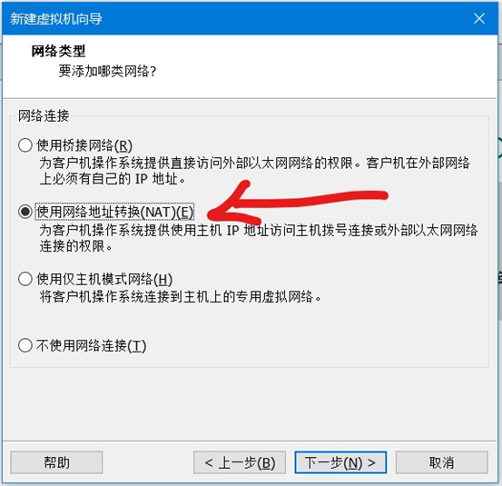 我们装好的虚拟机要上网,那我们就需要选择虚拟网卡了,网卡可以自定义,之前我选择网络模式是NAT模式,那这里也要选择NAT的网卡。