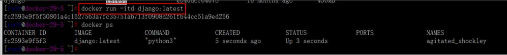 6、使用docker run -itd django:latest加载进行,验证镜像是否能够成功的“run”