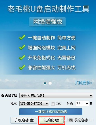 如果出现系统不能识别优盘的情况也不用害怕,有很多工具都可以还原优盘,比如使用老毛桃的“初始化U盘”功能。