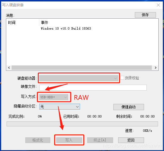 步骤三、选择对应的优盘,写入方式选择RAW,然后点击“写入”,等待完成。可能需要等待一段时间,请不要着急。