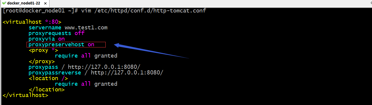 修改proxypreservehost off 为on ,然后重启httpd,再访问www.test1.com 看看是否还是给我们返回localhost虚拟主机的页面呢?
