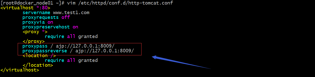 以上面的例子,httpd通过http协议反代tomcat和通过ajp协议反代tomcat,从httpd的配置上,没有本质的不同;不外乎就是把http协议修改成ajp协议,把后端tomcat8080端口改成8009端口;其他的都一样;如下所示