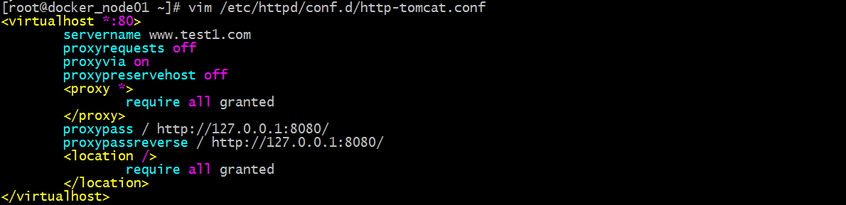 提示:以上配置表示访问www.test1.com 把请求反代到http://127.0.0.1:8080上;这里需要注意proxypreservehost off表示不把客户端传来的host首部传到tomcat上去,这意味着我们访问www.test1.com ,是不能够访问到tomcat中www.test1.com这台虚拟主机的,因为客户端访问httpd,host首部是www.test1.com,到了httpd后,httpd封装报文,它不会把客户端host首部原封不动的传给后面tomcat,而是重新封装host首部为127.0.0.1,因为封装后的报文host首部的值为127.0.0.1,到达tomcat后,它匹配不到127.0.0.1的虚拟主机,所以会从默认虚拟主机localhost返回,所以客户端访问www.teste1.com,会响应tomcat中localhost虚拟主机的页面;