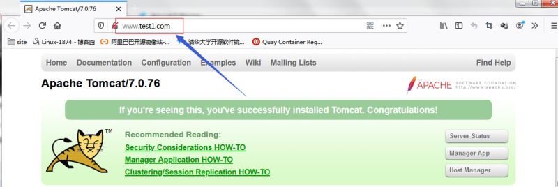 验证:重启httpd服务,访问www.test1.com 看看是否会把tomcat中www.test1.com 虚拟主机的页面响应给我们?