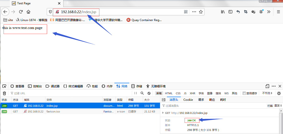 提示:可以看到访问192.168.0.22/index.jsp时,浏览器中响应了tomcat中www.test1.com这台虚拟主机提供的主页;
