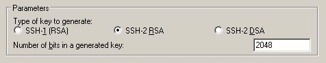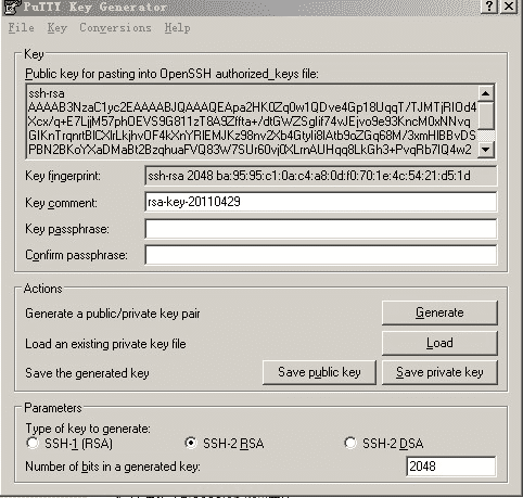 该工具可以生成三种格式的key:SSH-1(RSA) SSH-2(RSA) SSH-2(DSA),我们采用默认的格式即SSH-2(RSA)。Number of bits in a generated key这个是指生成的key的大小,这个数值越大,生成的key就越复杂,安全性就越高。这里我们写2048.