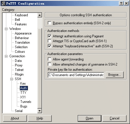 4)再设置putty选项,点窗口左侧的SSh –> Auth,单击窗口右侧的Browse…选择刚刚生成的私钥,再点Open,此时输入root,就不用输入密码就能登录了。