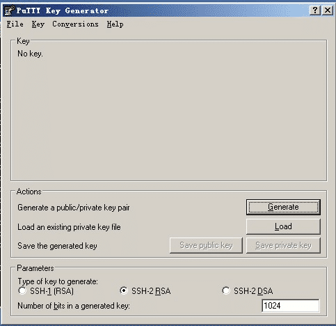 首先使用工具PUTTYGEN.EXE生成密钥对。打开工具PUTTYGEN.EXE后如下图所示: