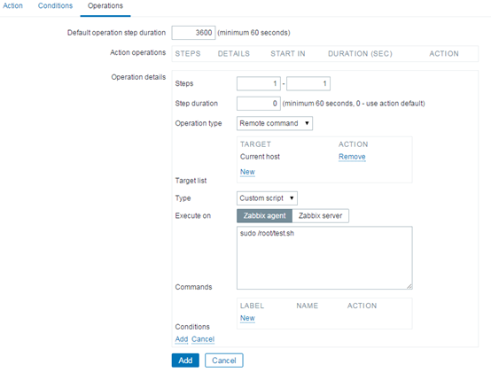Execute on:选择"Zabbix agent",命令为" sudo /root/test.sh