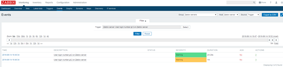 从截图可以看到,在线用户超过阀值,trigger为"PROBLEM"状态只持续了1分钟左右,即恢复到"OK"状态,表明强制第3个用户下线的脚本命令已执行,并且执行成功。