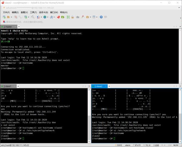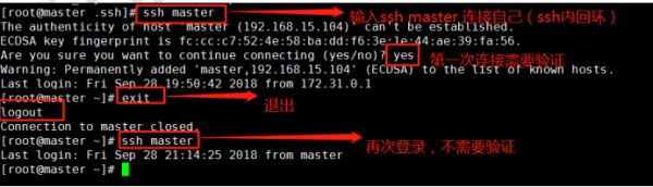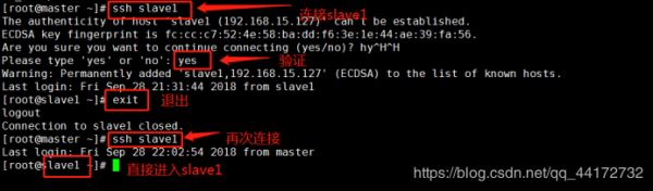 slave1 结点首次连接时需要,“yes”确认连接,这意味着 master 结点连接 slave1 结点时需要人工询问,无法自动连接,输入 yes 后成功接入,紧接着注销退出至 master 结点。