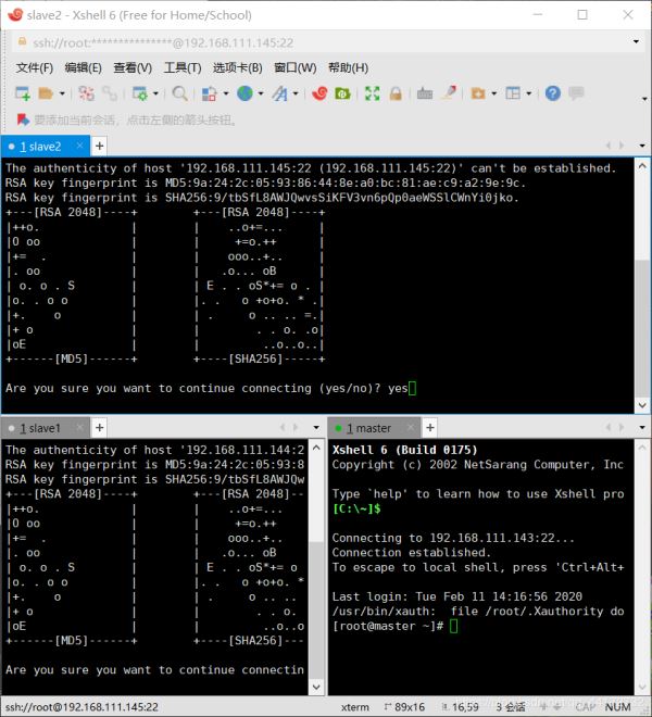 为了实现这个功能,两个 slave 结点的公钥文件中必须要包含主结点的公钥信息,这样