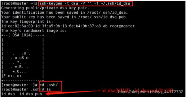(1)每个结点分别产生公私密钥: ssh-keygen -t dsa -P ‘' -f ~/.ssh/id_dsa(三台机器)秘钥产生目录在用户主目录下的.ssh 目录中,进入相应目录查看: cd .ssh/ (2)Id_dsa.pub 为公钥,id_dsa 为私钥,紧接着将公钥文件复制成 authorized_keys 文 件:(仅 master) cat id_dsa.pub >> authorized_keys(注意在.ssh/路径下操作) 在主机上连接自己,也叫做 ssh 内回环。 ssh master