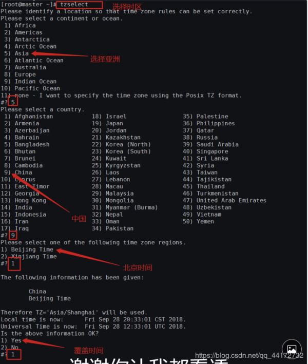 时间同步 时区一致。要保证设置主机时间准确,每台机器时区必须一致。实验中我们需要同步网络时间,因此要首先选择一样的时区。先确保时区一样,否则同步以后时间也是有时区差。可以使用 date 命令查看自己的机器时间. 选择时区:tzselect