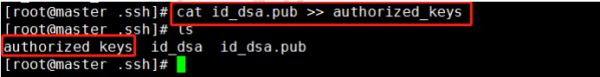 (2)Id_dsa.pub 为公钥,id_dsa 为私钥,紧接着将公钥文件复制成 authorized_keys 文 件:(仅 master)