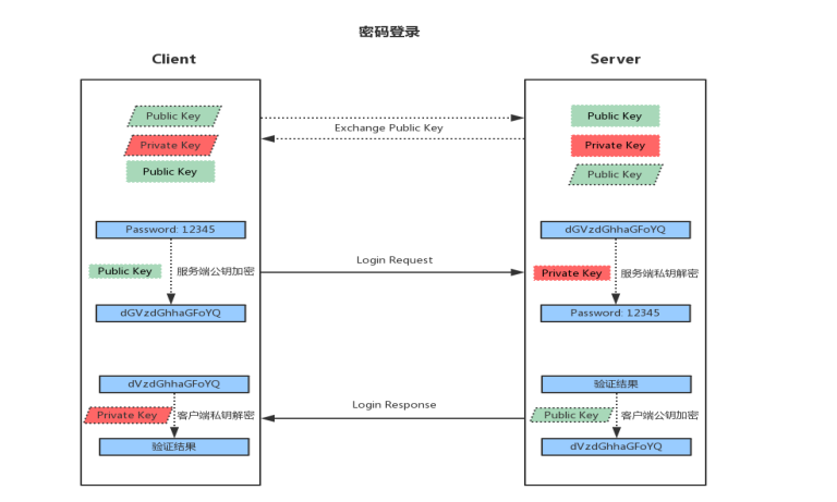 基于用户名口令登录是这样的流程:首先客户端发起ssh连接请求,服务端会把自己的公钥发送给客户端,客户端收到服务端的公钥后,把密码经过服务端的公钥加密后发送给服务端,服务端收到加密后的密码用自己的私钥进行解密,得到客户端发送过来的密码,然后它会拿这个密码进行验证,把验证的的结果用客户端的公钥加密并发送给客户端,客户端收到结果后,用自己的私钥解密,从而实现了验证过程,如果验证通过,那么客户端就登录成功,反之客户端登录失败。