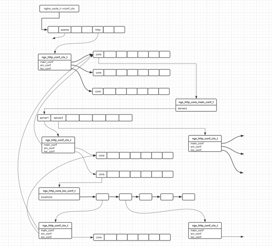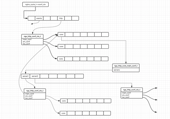 这个图稍微看起来有点复杂,但实际上并不复杂,按照配置块划分,上面的 ngx_http_conf_ctx_t 中存储的就是http块的配置,而下面的两个 ngx_http_conf_ctx_t 存储的就是两个server块中的配置,中间的引用过程是通过http块的 ngx_http_core_module 模块对应的 ngx_http_core_main_conf_t.servers 进行的。需要注意的一点是,上面的server块的配置中, main_conf 指针都是指向的http块的对应 ngx_http_conf_ctx_t 的 main_conf 属性。