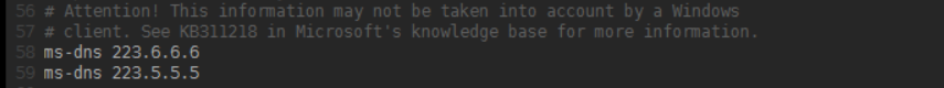 sudo vim /etc/ppp/pptpd-options #去掉58、59# 阿里云公共的dns 为223.6.6.6和223.5.5.5 所以图如下