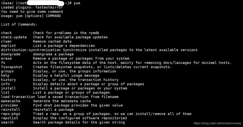 如果服务器中已经安装有yum则无需重复安装。可以用yum指令来检验。方法是直接输入yum、回车,如果已经安装有yum则会出现yum的列表。如下所示即为安装了yum的结果: