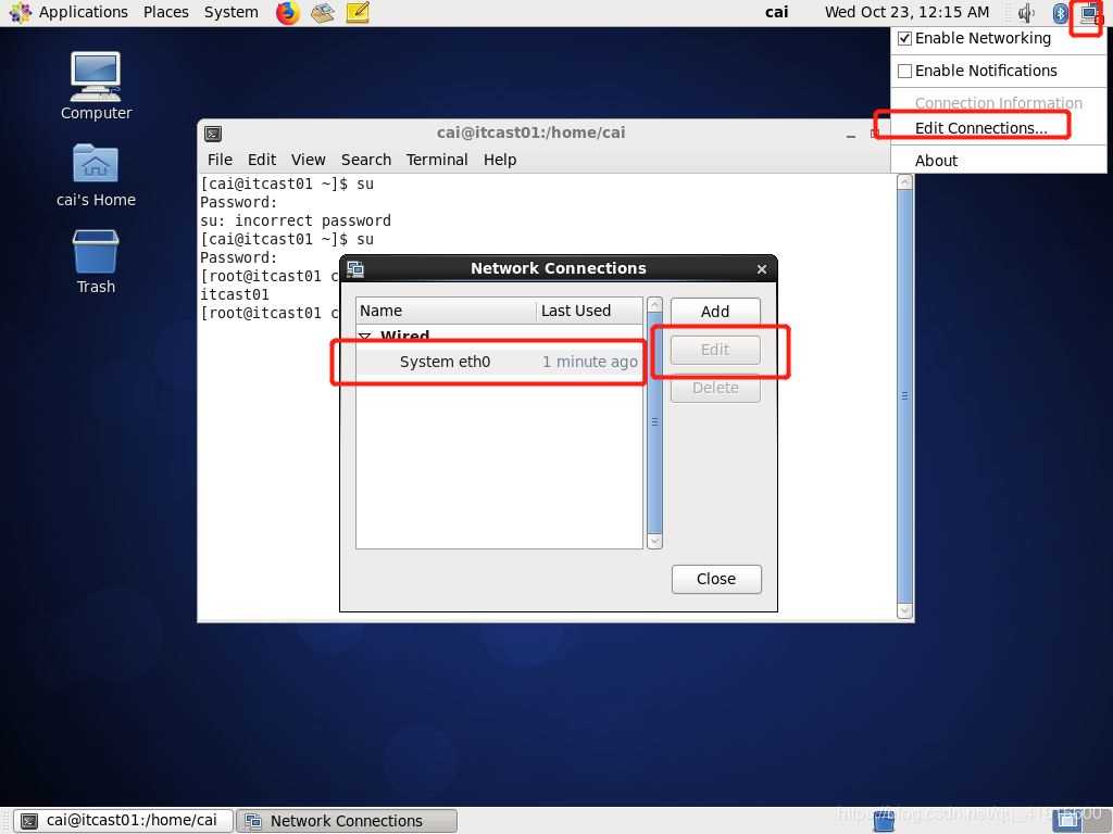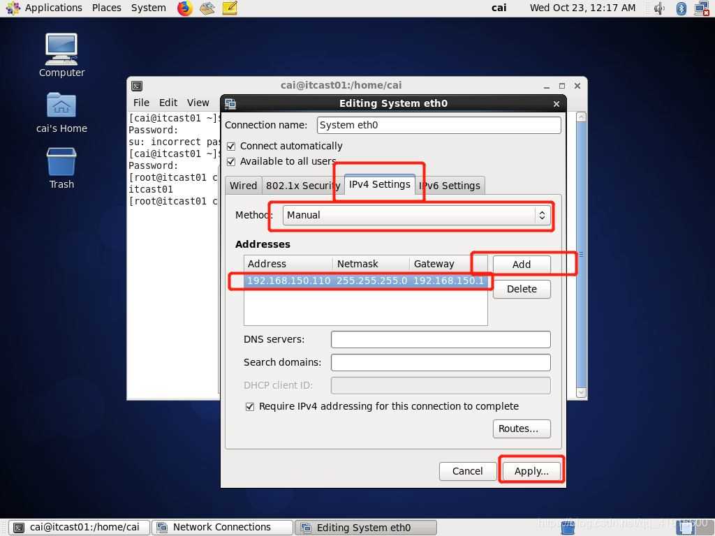 进入Linux图形界面 -> 右键点击右上方的两个小电脑 -> 点击Edit connections -> 选中当前网络System eth0 -> 点击edit按钮 -> 选择IPv4 -> method选择为manual -> 点击add按钮 -> 添加IP:192.168.150.110 子网掩码:255.255.255.0 网关:192.168.150.1 -> apply