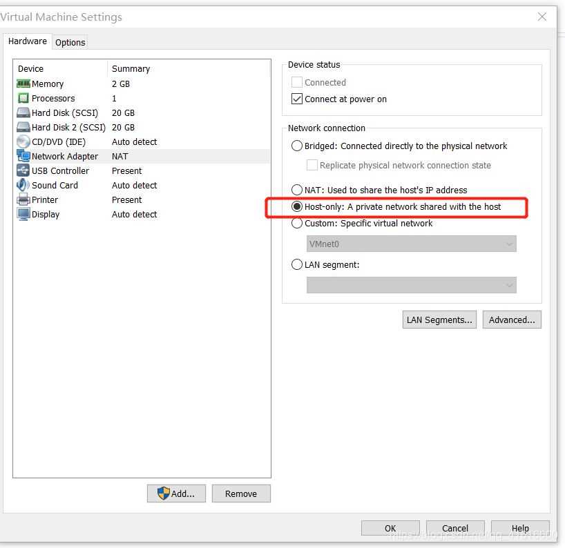 在虚拟软件上 --My Computer -> 选中虚拟机 -> 右键 -> settings -> network adapter -> host only -> ok