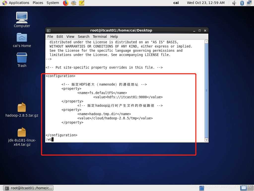 <configuration> <!-- 指定HDFS老大(namenode)的通信地址 --> <property> <name>fs.defaultFS</name> <value>hdfs://itcast01:9000</value> </property> <!-- 指定hadoop运行时产生文件的存储路径 --> <property> <name>hadoop.tmp.dir</name> <value>/cloud/hadoop-2.8.5/tmp</value> </property> </configuration>