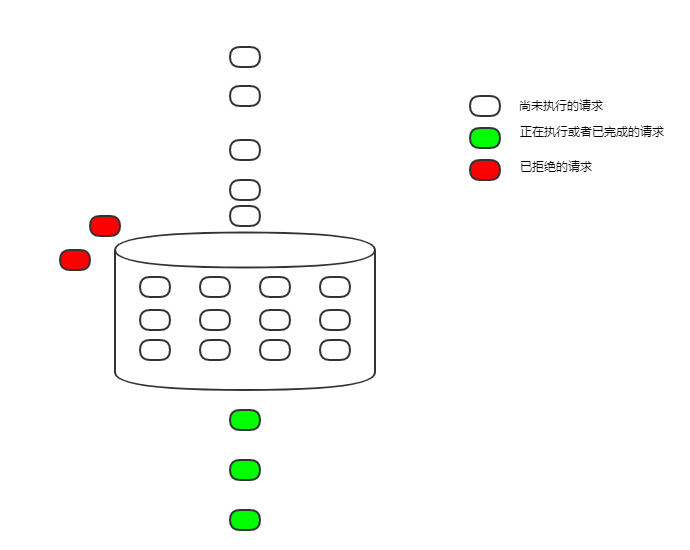 这样漏出的速度仍然是100ms一个请求,但并发而来,暂时得不到执行的请求,可以先缓存起来。只有当队列满了的时候,才会拒绝接受新请求。