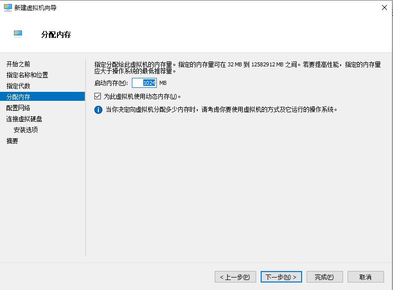 5、为虚拟机分配运行内存,勾选动态分配内存,虚拟机会使用系统内存,点击下一步。