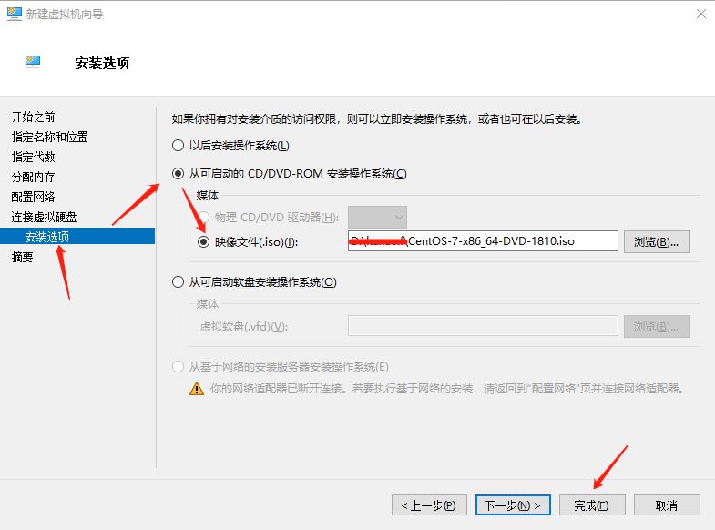 8、这里我们采用镜像安装。先搜索centos镜像文件,下载到本地,点击浏览,选择下载的镜像文件。点击下一步或者直接点击完成。