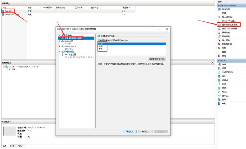 内部:即(NAT模式),Virtual Switch 不能连接物理网络适配器,只能用于在本地物理机上创建的VM,用于VM和本地物理机的通信,见https://www.jb51.net/article/120971.htm